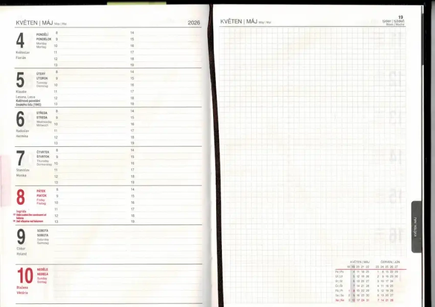 Povrch diáře si získal oblibu díky kvalitnímu svrchnímu materiálu, který je extrémně odolný vůči vnějšímu poškození. Týdenní rozvrh s česko-slovenským kalendáriem.