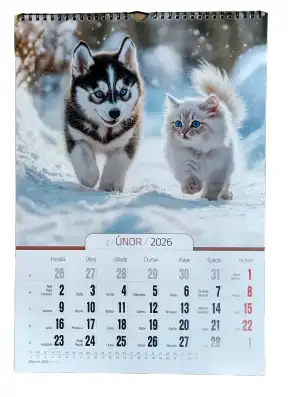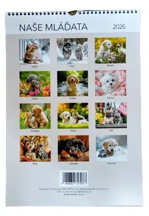 Fotografie roztomilých štěňat a koťátek v nástěnném kalendáři.